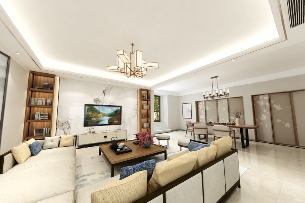 新中式風格是富含千年底蘊的東方中式風格與摩登時尚的現代風格彼此相遇結合,其精華之處在于以“一器一物皆是景,細微之處有乾坤”的古意為出發點,追隨時代的潮流,功能空間相互滲透,色彩空間相互碰撞,消除了傳統中式風格的沉悶和厚重,力圖在惹人癡迷的現代輕奢簡約中彰顯出傳統中式意蘊的雅致逸趣。